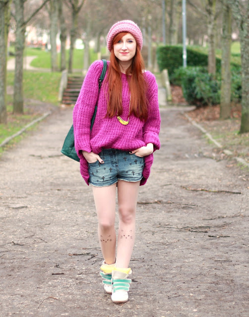 | Dernier Cri vintage beanie / H&M sweater / New Look shorts / Ebay tights / Ebay sneakers / Jennyfer bag / Banana necklace bought in Camden Market |