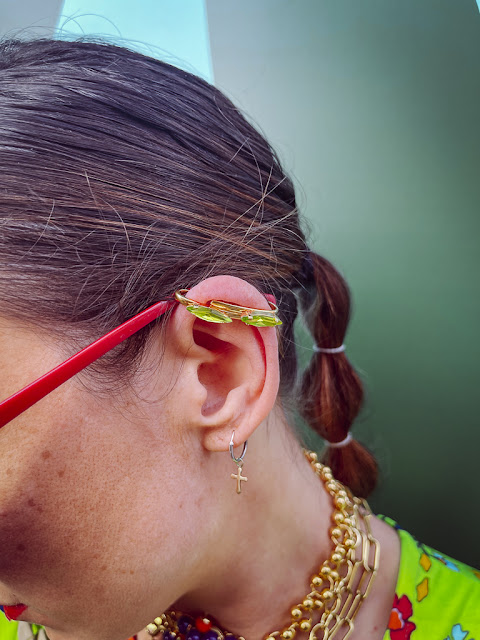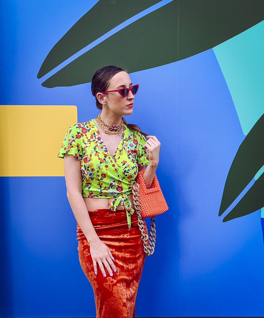 J'ai détourné ma robe orange en jupe sirène (et j'adore), et j'ai déniché ce petit top en friperie pour 2€. La nouveauté, ce sont mes accessoires ! J'ai reçu un colis incroyable de la part de Julie Sion, qui fait des bijoux que j'aime beaucoup. Elle propose souvent des modèles XXL, colorés, c'est vraiment tout ce que j'aime ! Ici, je porte un de ses choker (parmi d'autres colliers dorés), une boucle à porter sur le haut de l'oreille (super original non ?), et le clou du spectacle : ce joli sac en perles ! Je vous mets les liens juste en dessous ;)